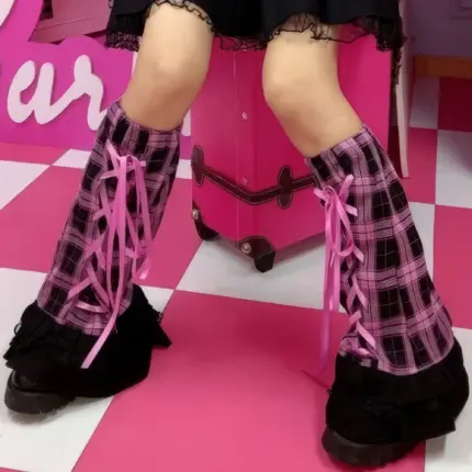 Pastel Goth Pink Ribbon Bows Plaid Leg Warmer Socks