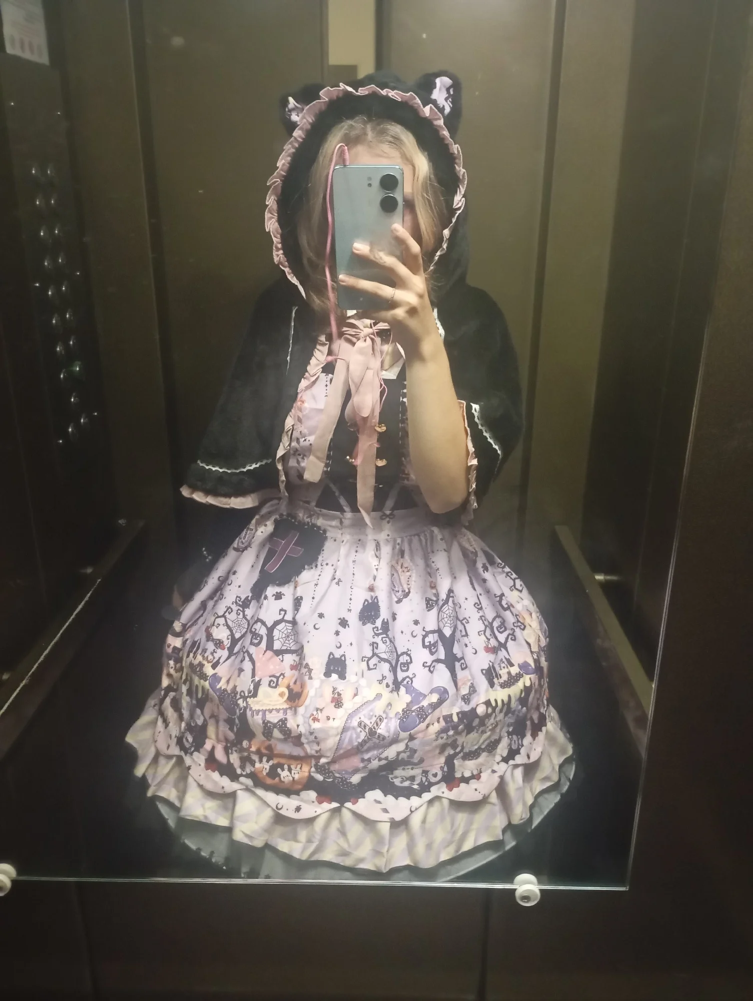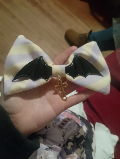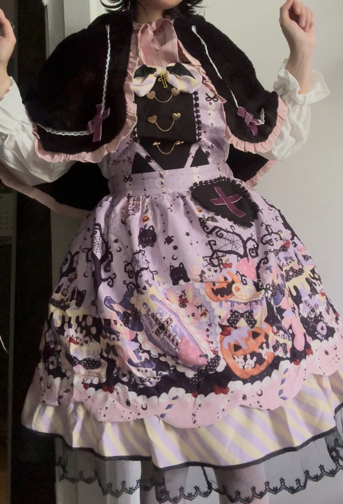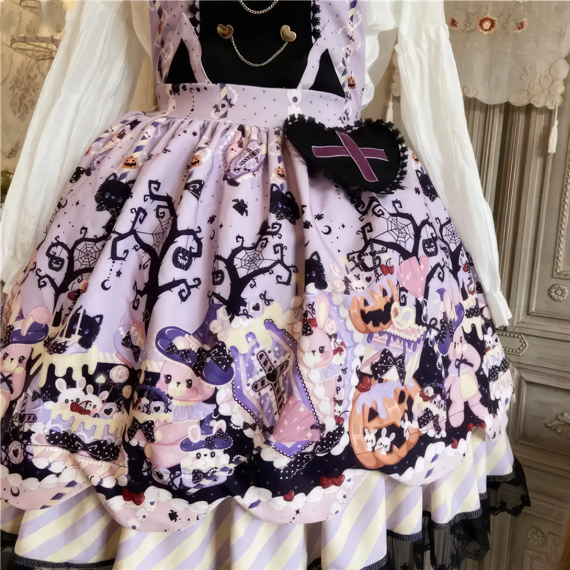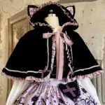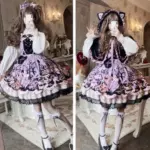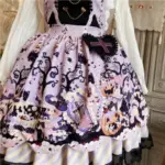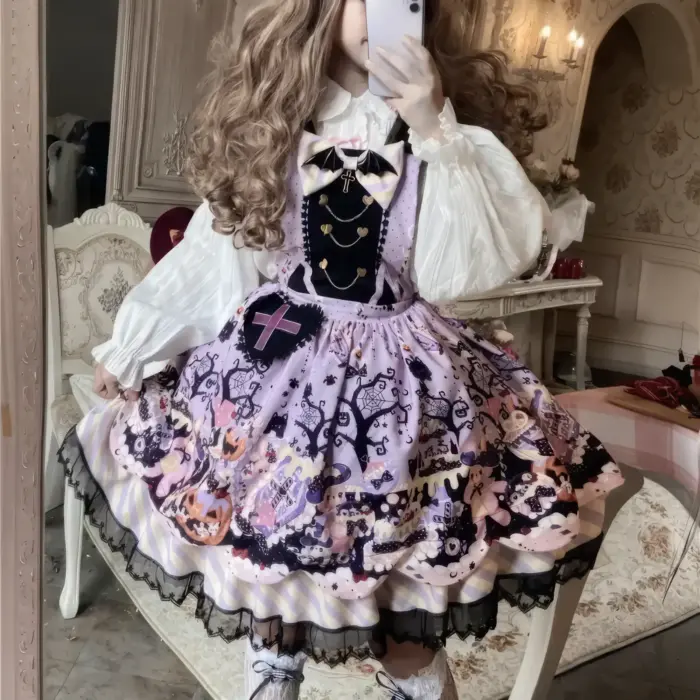 This Pastel Goth Halloween Style Dress blends spooky charm with sweet elegance. Featuring a lavender base with gothic prints, lace trim, and bat bow details, it’s perfect for kawaii goth fashion lovers who want a playful yet dark seasonal look.