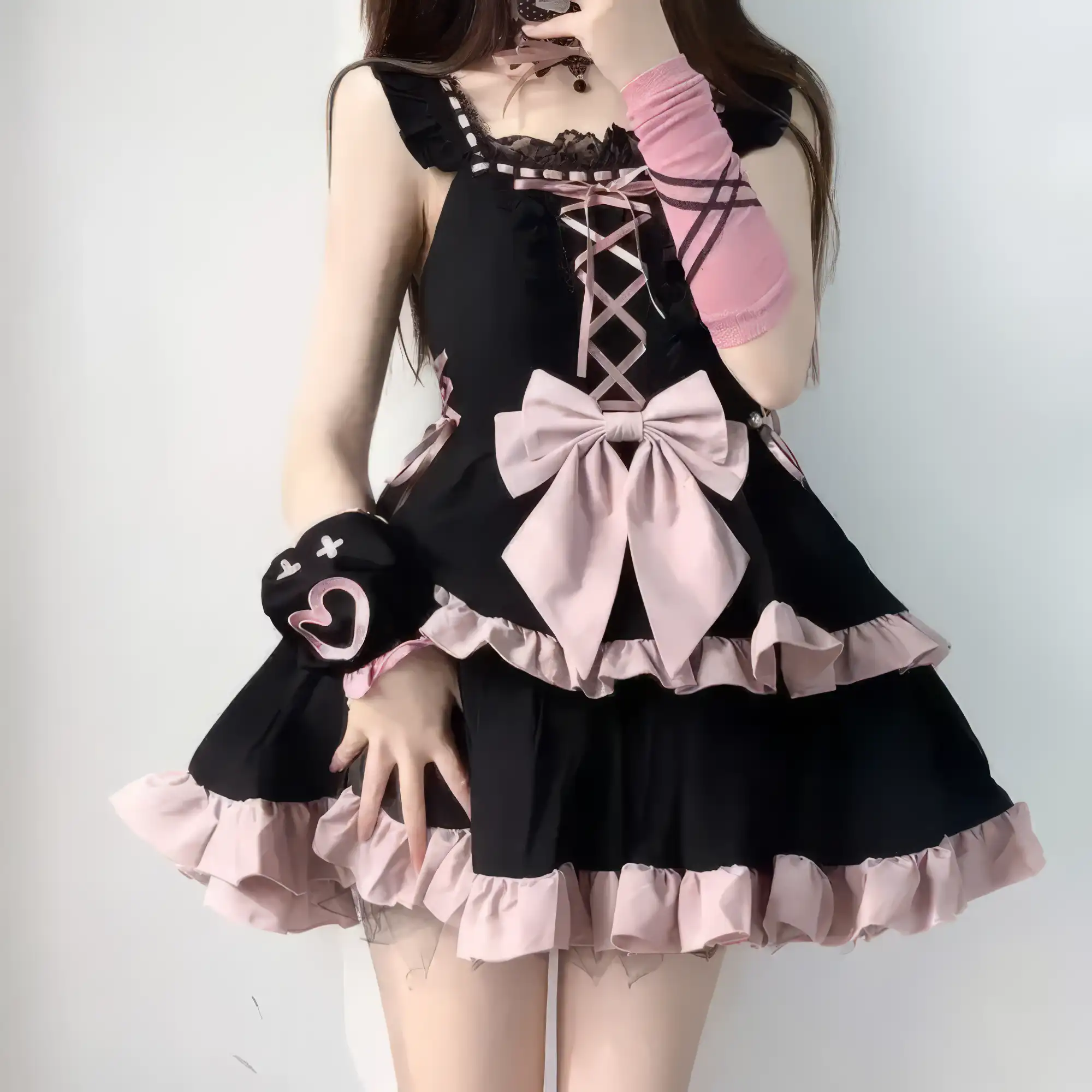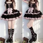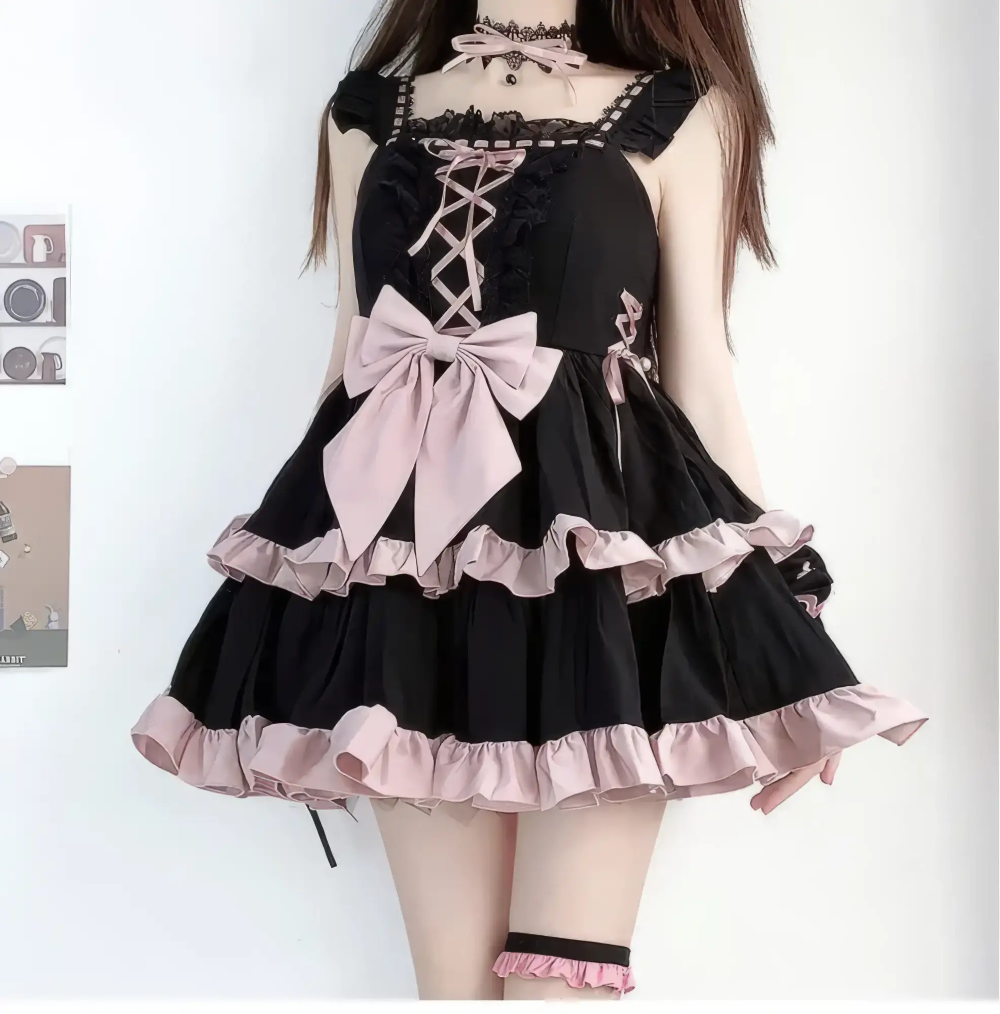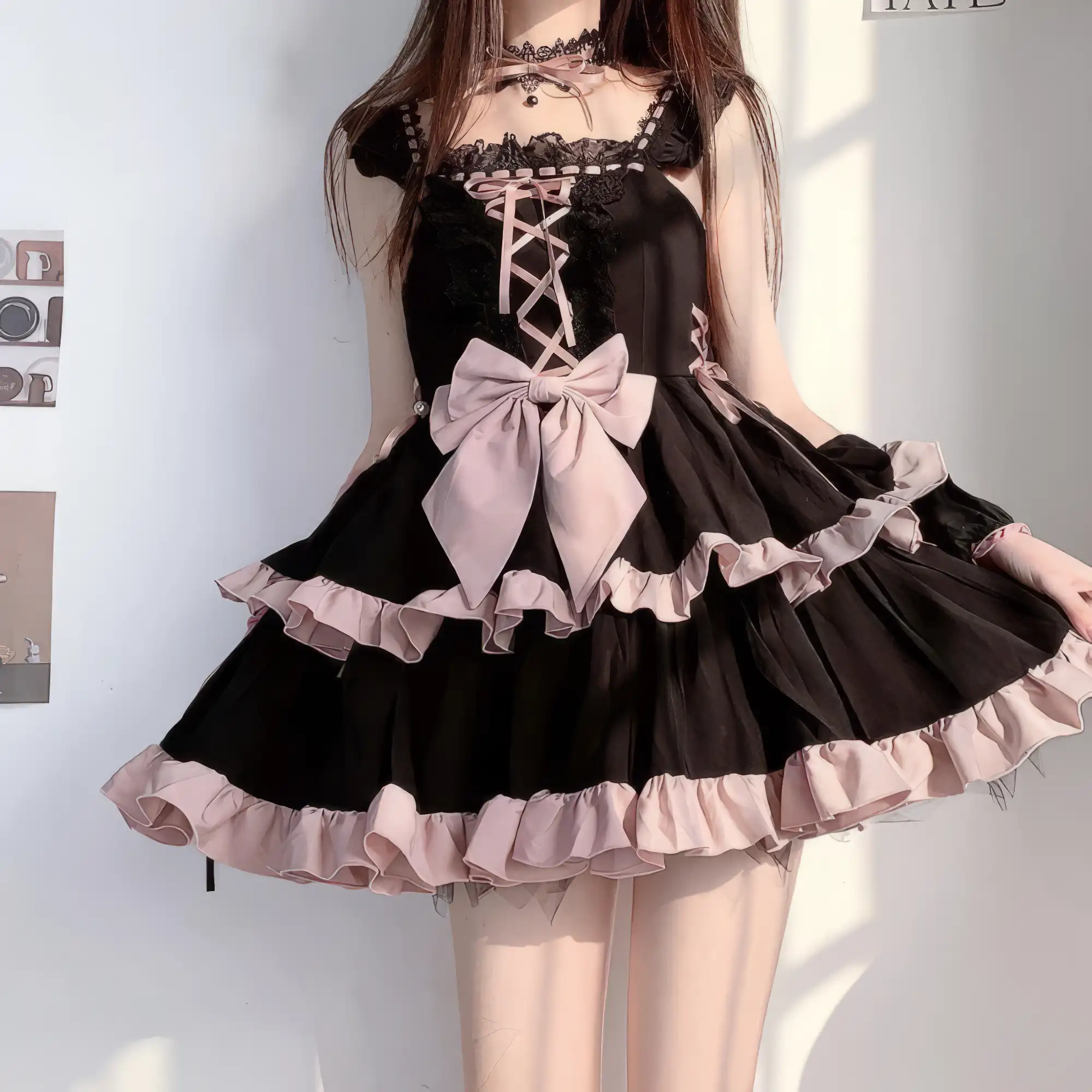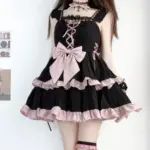 Sweet meets dark in this Pastel Goth Lace Lolita Dress. With a striking black base, soft pink ruffles, lace-up front, and oversized bow, it blends gothic charm with kawaii elegance. Perfect for pastel goth, lolita-inspired outfits, or street fashion statement.