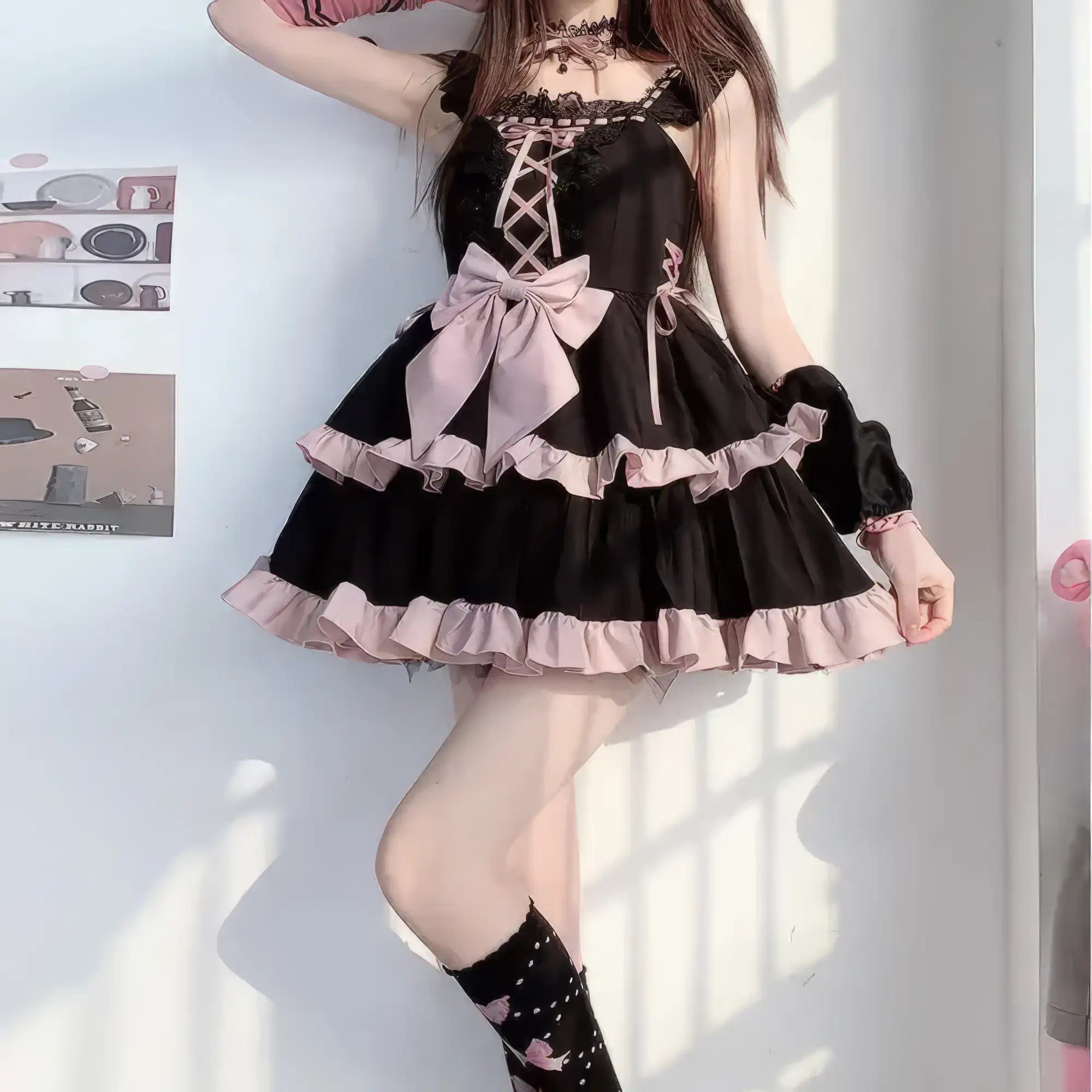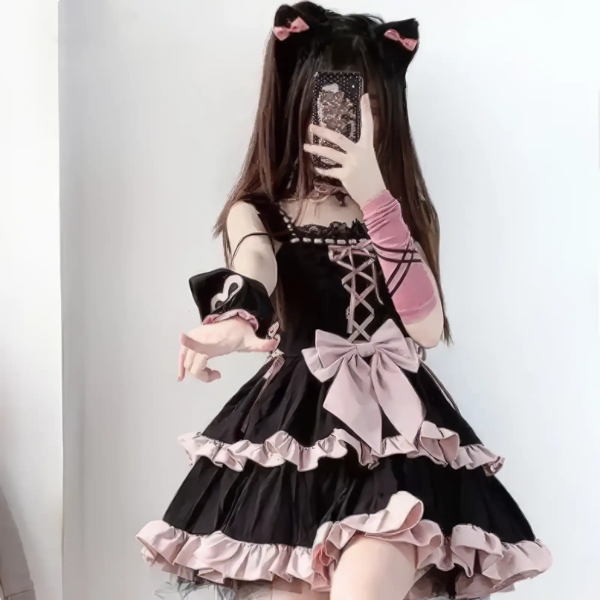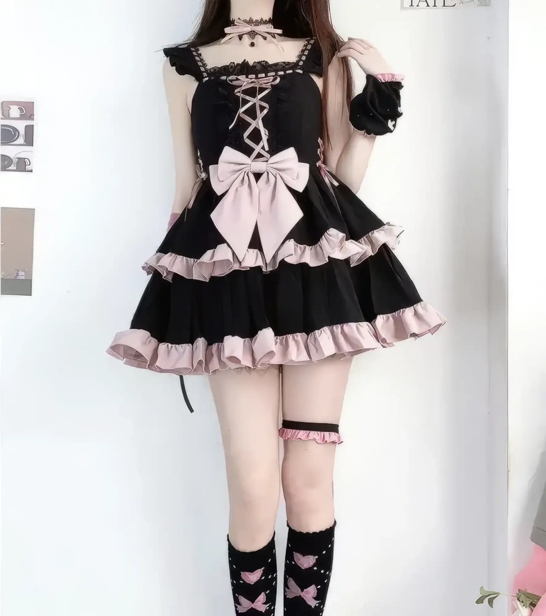Sweet meets dark in this Pastel Goth Lace Lolita Dress. With a striking black base, soft pink ruffles, lace-up front, and oversized bow, it blends gothic charm with kawaii elegance. Perfect for pastel goth, lolita-inspired outfits, or street fashion statement.